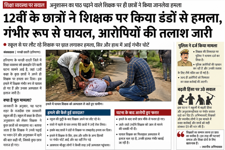 हरियाणा के एक जिले में शिक्षा व्यवस्था को झकझोर देने वाली घटना सामने आई है, जहां 12वीं कक्षा के कुछ छात्रों ने अपने ही शिक्षक पर हमला कर दिया। इस घटना में शिक्षक गंभीर रूप से घायल हो गए।