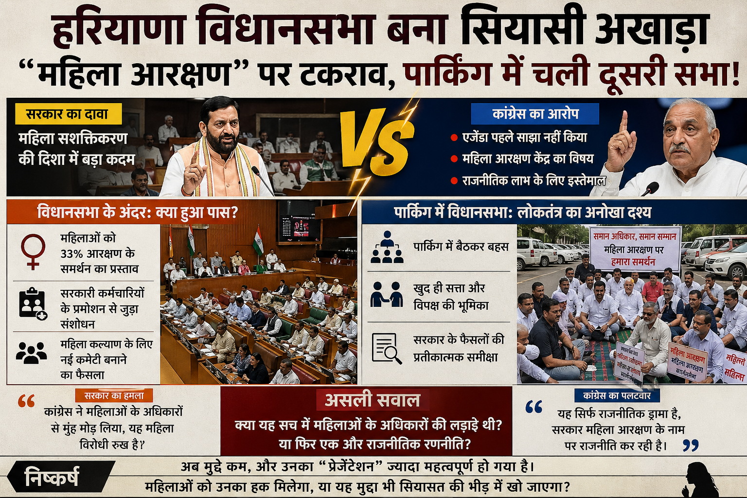हरियाणा की राजनीति में एक ऐसा दिन सामने आया जिसने लोकतंत्र की कार्यप्रणाली पर ही सवाल खड़े कर दिए। एक तरफ विधानसभा के अंदर आधिकारिक सत्र चल रहा था, तो दूसरी तरफ विपक्ष ने बाहर पार्किंग में “समानांतर सत्र” लगाकर विरोध दर्ज कराया। मुद्दा था—महिलाओं को 33% आरक्षण देने का प्रस्ताव।